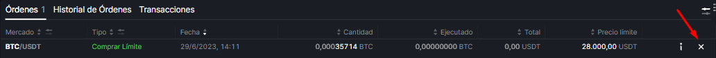 Para cancelar una orden limitada, busque la ventana con sus órdenes abiertas (debajo de la ventana del gráfico de precios) y haga clic en el botón "X".